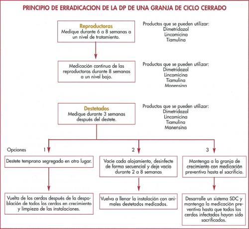 Esta es una enfermedad que ningún productor puede darse el lujo de tener. Hay dos opciones a medio y a largo plazo: despoblación y volver a poblar o tratar de erradicar la enfermedad sin realizar la despoblación. La primera se ha llevado a cabo con éxito en algunas granjas, si bien dependiendo de las circunstancias de la granja, la tasa de éxito puede llegar sólo hasta el 80%. La erradicación dentro de las granjas de cebo comienza con el tratamiento de las cerdas para eliminar el organismo y destetar cerdos libres de disentería. No se debe permitir que estos cerdos entren en contacto con cerdos infectados o sus heces. Hay una gran cantidad de programas que se pueden realizar a partir de este principio (fig. 9-36). Sin embargo existen ciertas reglas que se deben seguir: