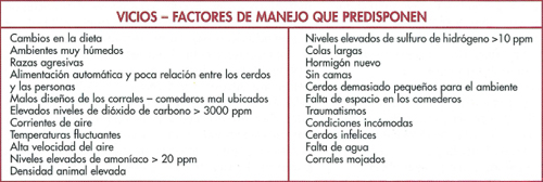 Deténgase durante unos minutos y observe a los cerdos que muerden las colas o las orejas y descubrirá que hay una característica predominante: los animales dan la impresión de estar muy tristes. Esto demuestra que el ambiente está lejos de ser el ideal. Los factores de manejo que contribuyen a esto se muestran en la figura 9-38. Estúdielos, identifique los más importantes y realice cambios hasta observar alguna respuesta. Separe a los cerdos que atacan debido a que una vez que el vicio se ha vuelto un hábito es difícil de detener.