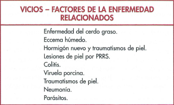 La enfermedad del cerdo graso o epidermitis exudativa es un factor pequeño pero importante en el desarrollo de las mordeduras de cola, orejas y masticación de los flancos. Al principio se desarrolla una infección de piel o un eccema húmedo en la punta de la cola o de la oreja con pequeñas áreas de suero que exudan hacia la superficie. En general comienza con una combinación de infección cutánea por el pienso y la rotura de la piel producida por un traumatismo. Después se produce la invasión por Staphylococc~s hyicus y se desarrolla una infección. El cerdo :s. atra1- do por la lesión y eventualmente esto lleva al v1c10. Esta situación es más clara cuando los cerdos destetados son llevados a lechoneras o unidades de transición o cuando son llevados a instalaciones de segunda fase, especialmente si se están realizando mezcl~s. de an~males. El hormigón nuevo tiene una superf1c1e alcalina y el pH elevado y la presión prolongada de la piel, especialmente cuando el suelo es enrejillado, produce llagas que se desarrollan en los jamones o flancos. Esto puede llevar a una infección y al vicio. Las lesiones en la cola de la epidermitis exudativa son irritantes causando el movimiento constante de la cola, lo que atrae a otros cerdos. Otras enfermedades, como neumonía, pueden poner en desventaja a algún cerdo que será traumatizado por otros (fig. 9-40).