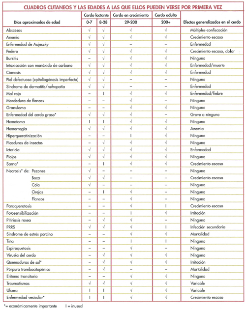 aparezcan, desde el nacimiento hasta el animal adulto, e indica si hay o no un efecto generalizado sobre el animal. Nótese que hay sólo cinco enfermedades principales que tienen alg una importancia económica; la enfermedad del cerdo graso, la sarna, las ne-