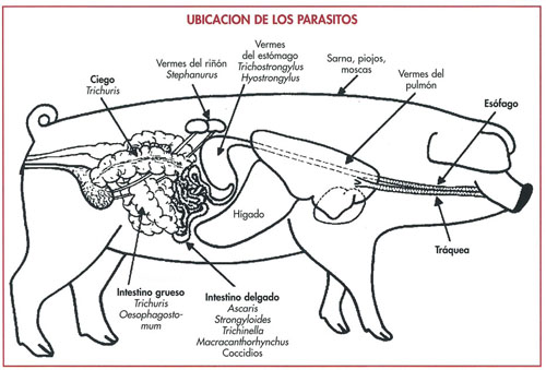 Este se representa en la figura 11-3. El verme adulto pone sus huevos en el intestino y son eliminados por las heces a la tierra. Los huevos desarrollan luego fases larvarias, pero sólo la última fase puede infectar un cerdo y desarrollar un verme adulto. Algunas larvas (áscaris y vermes del pulmón) ingresan al tracto digestivo y migran a través del hígado a los pulmones antes de completar su ciclo.