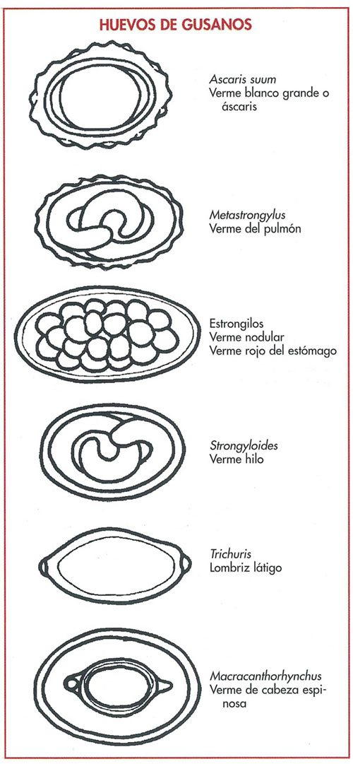 Se logra recolectando muestras de heces de cerdos de diferentes edades y examinándolas en busca de la presencia de huevos de vermes. Deben tomarse muestras de 25 g de los siguientes animales: 5 cerdas gestantes, 5 cerdas en lactación, 5 muestras separadas de heces de destetados de 1 2 semanas de edad y 5 muestras separadas de cerdos de cebo de 90 kg . Estas muestras se envían posteriormente a un laboratorio para su examen.