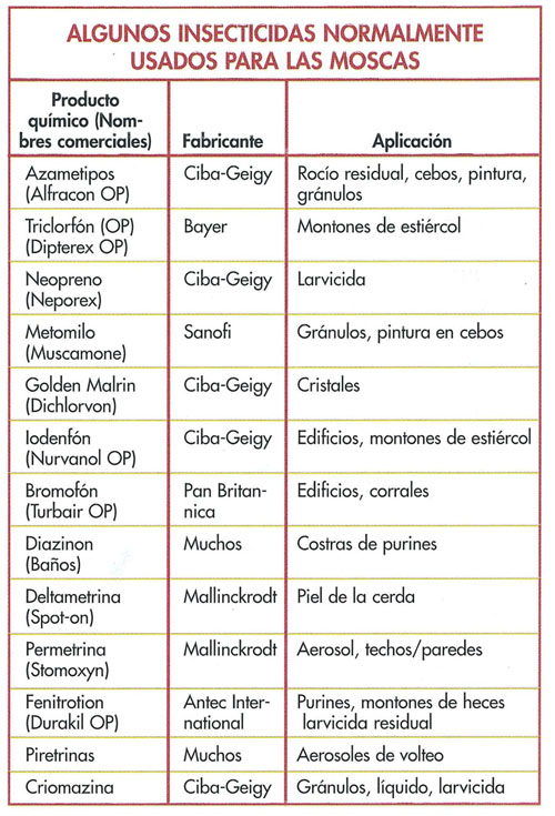 Estos incluyen electrocución, aerosoles (diarios o residuales), pinturas y cebos, larvicidas, trampas para moscas y predadores biológicos como otras moscas, escarabajos y avispas. También se ha informado el uso de medicación en el pienso usando insecticidas que pasan a través de la cerda. Los productos químicos principales usados incluyen piretrinas, compuestos organofosforados (OF), lindano y BHC. Algunos de los productos disponibles y sus usos se enumeran en la figura 11-14. Pueden usarse los siguientes procedimientos: