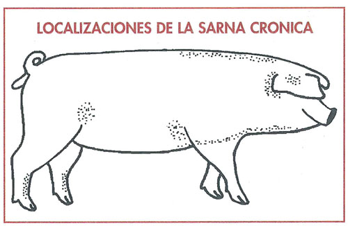 Enfermedades similaresLa sarna puede ser confundida con la descamación normal de la piel muerta (Hiperqueratinización -véase cap. 1 O) que se ve a menudo sobre el lomo y el cuello, pero este material escamoso puede eliminarse por frotación, dejando piel normal debajo. Las costras de la sarna, por el contrario, penetran en la superficie de la piel, no se eliminan fácilmente y el daño cutáneo es evidente. Otras enfermedades que pueden ser confundidas con la sarna incluyen la enfermedad del cerdo graso, la viruela del cerdo y las quemaduras solares. A veces, en granjas libres de sarna, los raspados de oreja pueden revelar la presencia de huevos de ácaros y de ácaros, pero sin enfermedad clínica. Estos ácaros no se distinguen del Sarcoptes scabiei porcino. Esto ocurre particularmente en cerdos mantenidos en lechos de paja vieja, que ha sido contaminada por otros animales, como ratas o pájaros con sus propios ácaros específicos de hospedador. Estos ácaros no sobreviven mucho tiempo ni causan enfermedad en el cerdo.