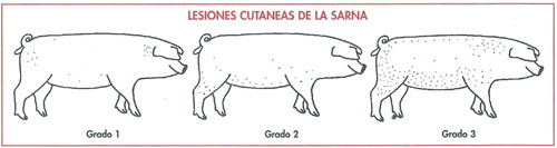 Puntuación promedio de graduación de cerdos examinados en el momento del sacrificio<0,3 - nivel muy bajo, sarna improbable. Otros factores, como picaduras de mosca, pueden causar lesiones similares. 0,5 - enfermedad bien controlada, sin efectos económicos. 1-1,5 - enfermedad activa, irritación considerable y rascado. +2 - enfermedad grave; pérdidas previstas de O, 1 en la eficacia alimenticia y 7-1 O días adicionales para alcanzar el peso de sacrificio.