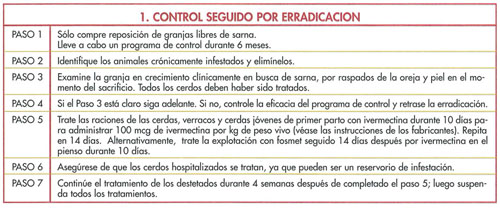 Programas de control - Se basan en el hecho de que las cerdas de cría y los verracos son los reservorios permanentes de la infestación, ya que los cerdos en crecimiento y de cebo son constantemente eliminados para sacrificarlos. El objetivo es prevenir que la cerda en lactación infeste a sus lechones, produciendo de esta forma animales libres de sarna. Los cerdos de crecimiento y de cebo no están en contacto con la granja de cría.