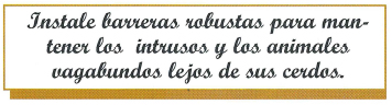 tales de los EE.UU.), y si las puertas son fuertes y la cerradura funciona, puede no ser necesario un cerco. La necesidad de barreras físicas fuertes depende del país en el que usted cría. Los animales más peligrosos son los cerdos salvajes, particularmente donde ellos pueden infectarse con peste porcina clásica (cólera porcino) como en Alemania, Polonia y posiblemente Italia. Los perros vagabundos pueden diseminar la gastroenteritis transmisible (GED y probablemente otras enfermedades. Si usted debe tener un perro de guardia en el complejo depende del nivel de criminalidad (robo de cerdos y de equipo). Algunas granjas de cerdos en países como Portugal tienen patrullas entre dos cercos perimetrales paralelos. Los gatos pueden ser un recurso si se mantienen dentro de los edificios para cerdos todo el tiempo, como en Dinamarca. Ellos ayudan a controlar ratones y ratas. Pero si se mantienen perros y gatos en el complejo o edificios de los cerdos, no los alimente con productos de carne porcina.