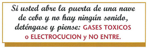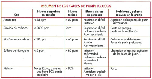 SULFURO DE HIDROGENO (H2 S)Este es uno de los gases tóxicos importantes encontrados en las granjas y es potencialmente letal. El gas es producido por la descomposición bacteriana anaerobia de materia orgánica, particularmente la que se encuentra en heces y en purín . La mayor fuente de H2 S y de hecho el mayor potencial para producir desastres proviene del purín que se acumula en fosas debajo de las rejillas de las naves de cebo. Pueden quedar atrapadas bolsas de gas y cuando el purín es agitado y eliminado de las instalaciones existe riesgo de envenenamiento agudo y fatal no sólo para los cerdos sino también para las personas. Hay una concentración baja de H2S en la mayoría de las instalaciones de alojamiento de cerdos, normalmente menos de 1 00 ppm. Las concentraciones de H2S pueden ser detectadas por el olfato humano dentro del rango de 0,05 a 200 ppm. Cuando los niveles superan el límite superior y la sensibilidad del olfato para detectar el gas disminuye significativamente, la situación se vuelve potencialmente peligrosa.