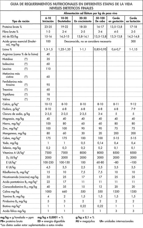 Los nutrientes esenciales comprenden proteínas y aminoácidos, energía, ácidos grasos esenciales, agua, vitaminas y minerales. La figura 14-1 presenta una guía de los requerimientos normales de acuerdo al peso del cerdo y al tipo de ración.