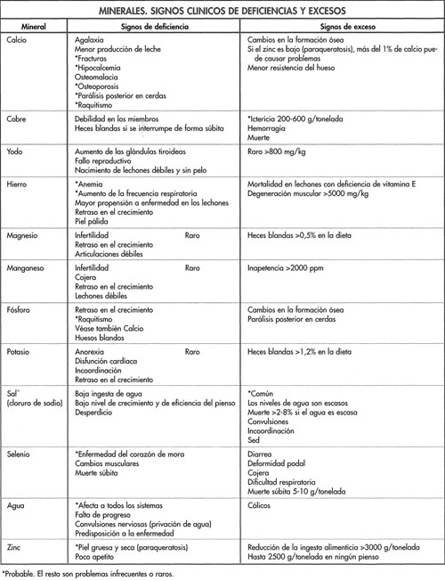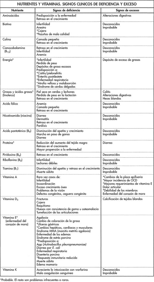 Ante la sospecha de un problema relacionado con la alimentación, examine la figura 14-2. Primero identifique el problema de acuerdo a los síntomas, los cuales pueden sugerir las deficiencias potenciales de nutrientes o las áreas problemáticas. En ese momento sería conveniente consultar con el proveedor del pienso ya que al conocer la composición de la dieta es posible determinar áreas más específicas, como ingesta insuficiente de energía o de lisina para determinados grupos de edad de cerdos en ese medio ambiente. La figura 14-3 relaciona los signos clínicos con posibles causas de deficiencias o excesos de minerales y la figura 14-4 los relaciona con las de nutrientes y vitaminas, aunque muchas de estas deficiencias no son comunes en la actualidad. Los detalles acerca de nutrientes individuales se presentan en las páginas siguientes. Sin embargo, los problemas actuales más comunes en las granjas se relacionan con una dieta insuficiente de aminoácidos y de energía para satisfacer los requerimientos del porcino.