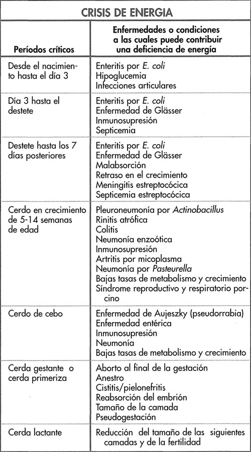 Los requerimientos energéticos dependen del peso del cerdo, su tasa de crecimiento, la cantidad requerida para el mantenimiento y su estadio en el ciclo reproductivo; es importante no subestimarlos en cerdas durante la lactación. La figura 14-6 muestra los períodos críticos de demanda de energía durante la vida del cerdo y las enfermedades asociadas con la deficiencia de energía. La ingesta diaria de energía y el nivel de energía por kg de pienso son factores cruciales que ayudan al cerdo a mantener un estado de energía positivo (anabólico) en lugar de uno negativo (catabólico). La ingesta de energía también es esencial para maximizar el éxito repro