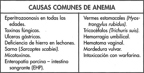 Las cáusas comunes de anemia se presentan en la figura 14-1 O pero la deficiencia de hierro y la anemia en los lechones son las más comunes e importantes. La anemia de causa nutricional es poco frecuente durante el crecimiento y en animales adultos, pero las enfermedades suelen causar anemia secundaria. La anemia secundaria a enfermedades específicas como pleuroneumonía por Actinobacillus o a la enfermedad de Glasser también es frecuente.