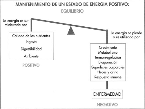 Un ejemplo típico sería el desarrollo de enfermedad respiratoria debido a pleuroneumonía por Actinobacillus. Los cerdos portadores de estos mitroorganismos suelen desarrollar neumonía aguda cuando son trasladados desde corrales con suelo de cemento sólido a otros con suelo de rejillas. Esto incrementa la temperatura crítica inferior (TCI) del cerdo y por lo tanto aumenta el requerimiento energético. Un cambio en el pienso o en el sistema de alimentación junto con una reducción de la densidad del stock exagera aun más el problema. El sistema inmunitario no responde con eficiencia, el metabolismo del cerdo se altera y se desarrolla enfermedad aguda. La energía no se puede considerar por separado con exclusión de otros nutrientes y los siguientes factores se deben tomar en cuenta:
