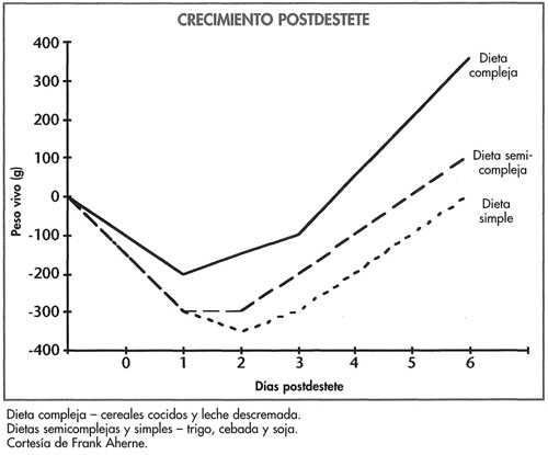 El cerdo experimenta cambios espectaculares en el destete debido al cambio repentino desde una dieta líquida a una sólida. El reflejo condicionado que induce a los lechones a mamar con regularidad también se pierde. La deshidratación asociada con baja ingesta de agua y atrofia marcada de las vellosidades es frecuente en los primeros 7 días del destete. Asegurar que la velocidad del flujo de los bebederos tipo chupete no sea inferior a 0,6 L/minuto. Es aconsejable ofrecer agua en bebederos abiertos pequeños o en cuencos todos los días durante los primeros 5-7 días posteriores al destete. La falta de leche y la atrofia de las vellosidades durante el destete reducen la disponibilidad de líquido para los lechones en las primeras 48 horas.