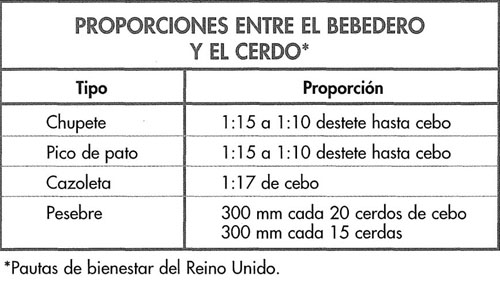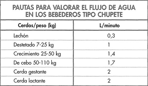 Los cambios en la ingesta de agua desde la gestación hasta la lactación son considerables. Las cerdas que tienen baja ingesta de agua durante la lactación suelen criar camadas más pequeñas y por ello es importante estimularlas a beber desde que ingresan en la paridera. Esto se logra ofreciendo 4,5 L de agua 2 veces por día en el pienso hasta los 2 a 3 días posteriores al parto. El flujo de agua a través de un bebedero tipo chupete se debe aproximar a 1,5 a 2 L/minuto para cerdas lactantes. La ingesta de agua en cerdas gestantes varía desde 9 a 18 L/día y durante la lactación, desde 18 a 36 L/día.