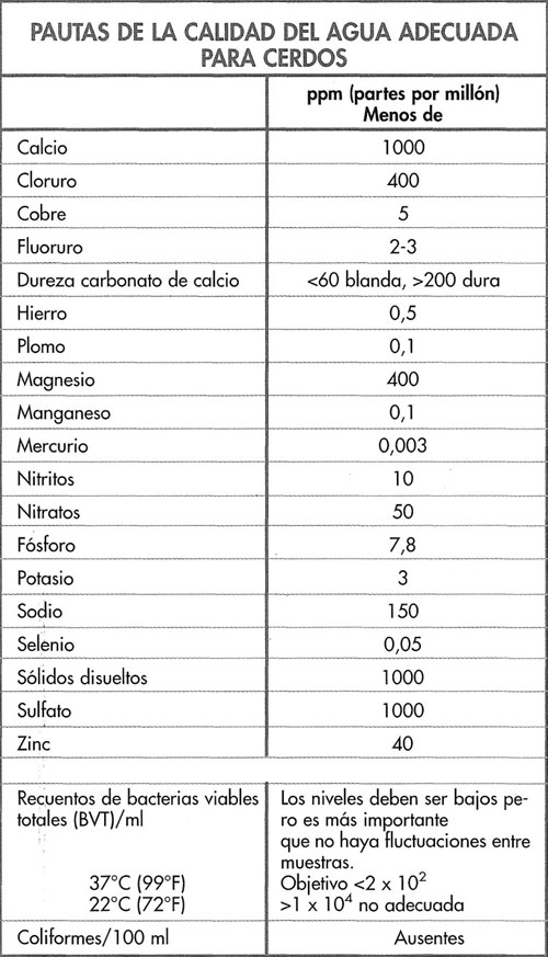 La calidad química del agua se valora determinando los sólidos disueltos totales, el pH (alcalinidad o acidez), el contenido de hierro y la presencia de nitratos o nitritos. Otras evaluaciones comprenden los niveles de sulfatos, magnesio, cloruro, potasio, calcio, sodio y manganeso. Los sólidos totales en agua representan la cantidad de materia disuelta. Si este nivel es inferior a 1 000 ppm no tienen relevancia, pero cuando supera las 6000 ppm el agua se vuelve inadecuada para los cerdos. Por lo general, el agua con bajo contenido total de sólidos es de buena calidad y segura.