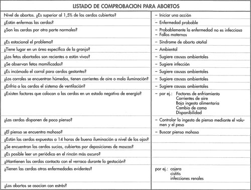 calidad o reducción de la ingesta alimenticia. La última situación podría asociarse con un cambio del personal encargado de la granja. Los brotes de aborto se pueden producir cuando la alimentación con gránulos se sustituye por harina o cuando el pienso se presenta de acuerdo al volumen y no al peso. Los ambientes húmedos y mojados o las corrientes de aire causan enfriamiento del animal e incrementan la demanda de energía. Una característica importante de los abortos de causa ambiental es que la cerda se mantiene normal, con frecuencia ingiere el pienso por la mañana y expulsa la camada por la tarde. Algunas personas denominan "abortos de parto" a esta situación. Los fetos abortados son normales y la cerda no presenta signos de enfermedad. El mecanismo desencadenante es la regresión del cuerpo lúteo.