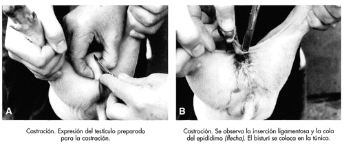 - Una persona sostiene el lechón entre las piernas con los testículos presentados como se ilustra o bien se puede emplear una tarim;