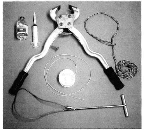 Sedantes - Stresnil. Los verracos grandes pueden requerir un anestésico suave administrado por el veterinario. Alambre o cuerda con nudo corredizo para la su¡eción física. Un trozo de madera para mantener la boca abierta. 1 Un par de esquiladoras o cortadores de pezuñas o alambre para embriotomía con mango (fig. 15-11 ).