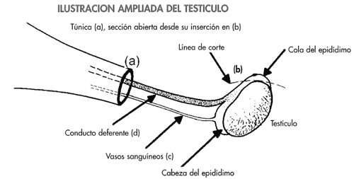 - Levantar cada testicube e identificar la tumefaccion azulada grande correspondiente a la cola del epididimo.