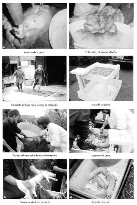 Un área libre de cerdos para recibir el útero y los lechones. Tres personas para la recepción que no hayan tenido contacto con cer!.