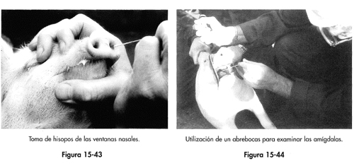 • Para la toma de hisopos de las amígdalas, sostener la cabeza del cerdo por las orejas o sujetarlo mediante un iazo corredizo. A continuación, el operador abre la boca del animal utilizando un abrebocas {fig. 15-44).