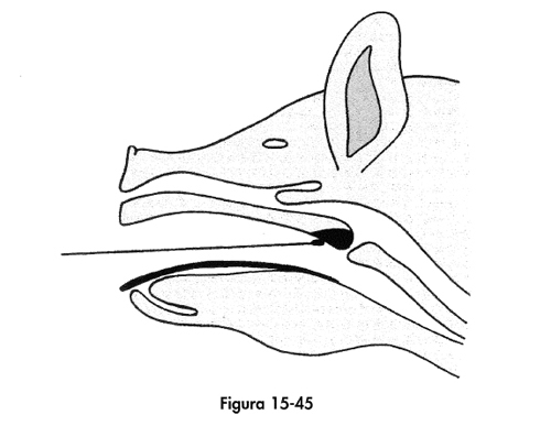 • Sujetar al cerdo con un lazo si pesa más de 15 kg. Abrir la boca con el abrebocas {fig. 15-46), dejando la lengua por debajo de la barra. Deprimir la lengua e identificar la; amígdalas con ayuda de la linterna. Las amígdalas son áreas rugosas ubicadas a cada lado del paladar blando en el fondo de la garganta {fig. 15-45).